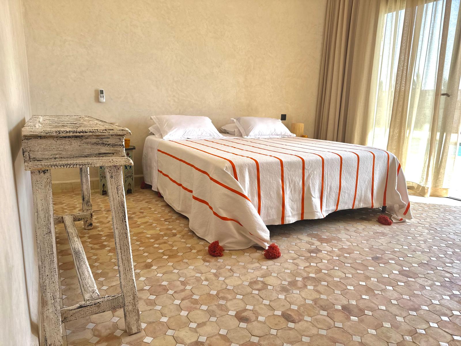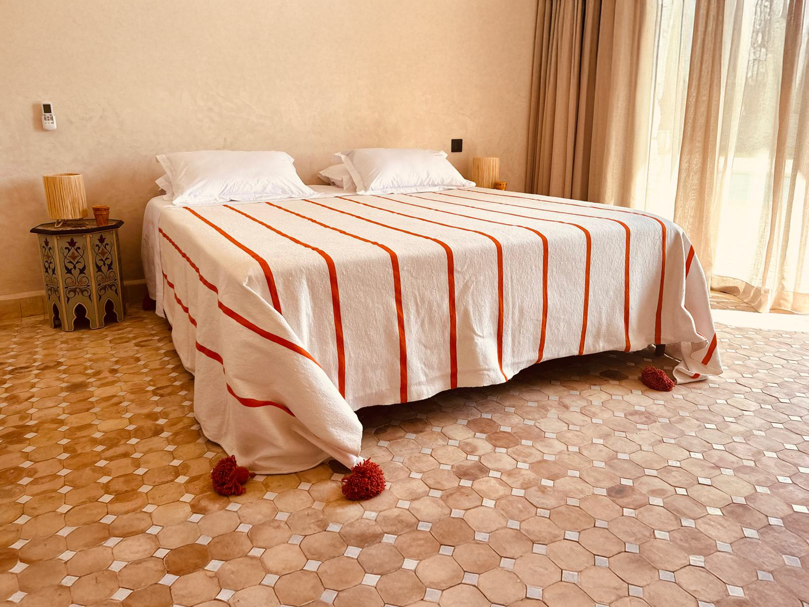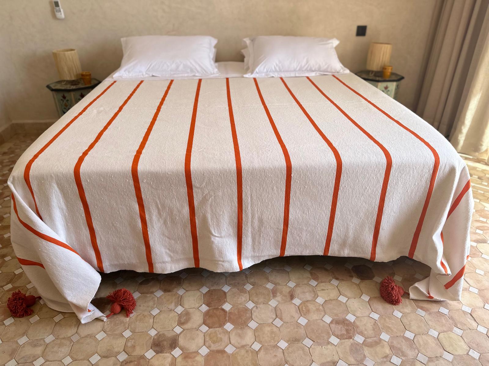 Aza Fran: la stanza che accarezza i sensi, i toni vibranti dell’arancione e dello zafferano abbracciano l’eleganza rustica dei tavolini e della consolle, pezzi unici dell’artigianato marocchino.